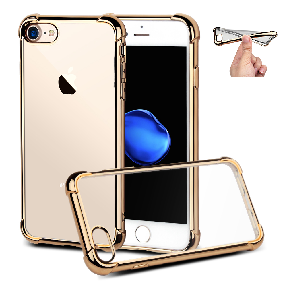 Apple iPhone 7 Goud Transparante shock proof Flexibele cover. Dit hoesje is een transparante cover met een stijlvolle, kleurrijke rubberen frame die bescherming biedt aan de smartphone. De gepantserde rand en versterkte hoeken zorgen er voor dat de gehele telefoon, inclusief camera en scherm beschermd zijn. De cover is extra helder en compact, waardoor de contouren van het toestel goed zichtbaar blijven. Door rubberen knoppen aan de zijkant behoud je volledige toegang tot de knoppen van de telefoon.