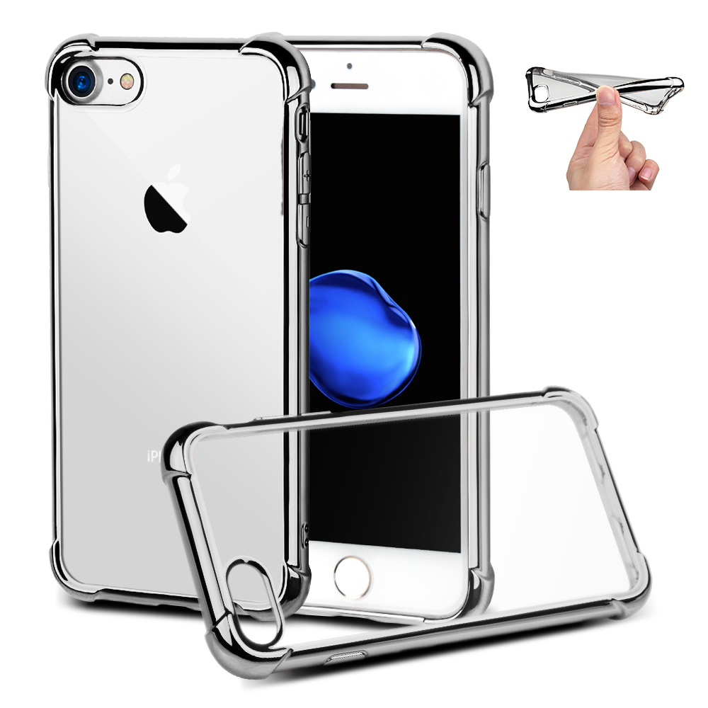 Apple iPhone 7/8 Zilver Transparante shock proof Flexibele cover. Dit hoesje is een transparante cover met een stijlvolle, kleurrijke rubberen frame die bescherming biedt aan de smartphone. De gepantserde rand en versterkte hoeken zorgen er voor dat de gehele telefoon, inclusief camera en scherm beschermd zijn. De cover is extra helder en compact, waardoor de contouren van het toestel goed zichtbaar blijven. Door rubberen knoppen aan de zijkant behoud je volledige toegang tot de knoppen van de telefoon.