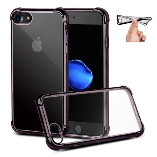 Apple iPhone 7 Zwart Transparante shock proof Flexibele cover. Dit hoesje is een transparante cover met een stijlvolle, kleurrijke rubberen frame die bescherming biedt aan de smartphone. De gepantserde rand en versterkte hoeken zorgen er voor dat de gehele telefoon, inclusief camera en scherm beschermd zijn. De cover is extra helder en compact, waardoor de contouren van het toestel goed zichtbaar blijven. Door rubberen knoppen aan de zijkant behoud je volledige toegang tot de knoppen van de telefoon.